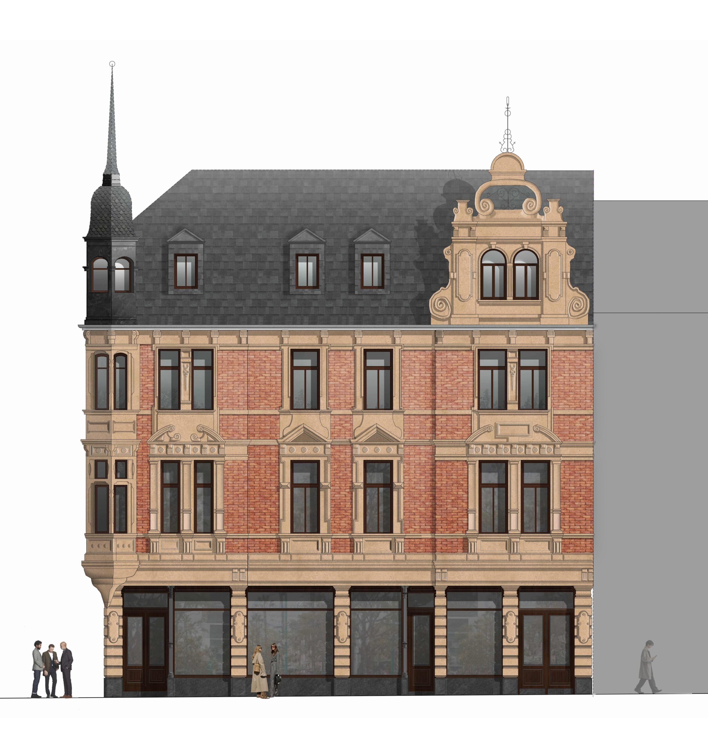 Rekonstruktion und denkmalgerechte Wiederherstellung einer historischen Straßenfassade mit dem Ziel, die ursprüngliche architektonische Qualität und Proportionen des Gebäudes langfristig zu sichern. Beschädigte und verlorene Fassadenelemente wurden sorgfältig restauriert oder originalgetreu neu gefertigt, um das historische Erscheinungsbild präzise wiederherzustellen.